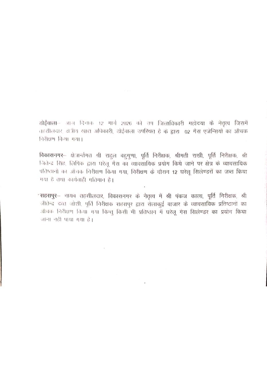 जिला प्रशासन का एक्शन शुरू डोईवाला में 2 तथा विकास नगर में 12 घरेलू सिलेंडर व्यावसायिक उपयोग किए जाने पर किए गए जब्त।